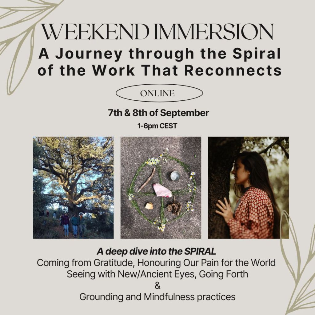 I am inviting you to an online weekend immersion to take a deep dive into the Spiral of the Work That Reconnects, to harness its power to resource our personal and collective resilience to take part in the healing of our world. We will also spend time with grounding and mindfulness practices so we can also cultivate a kind presence and capacity to be with.